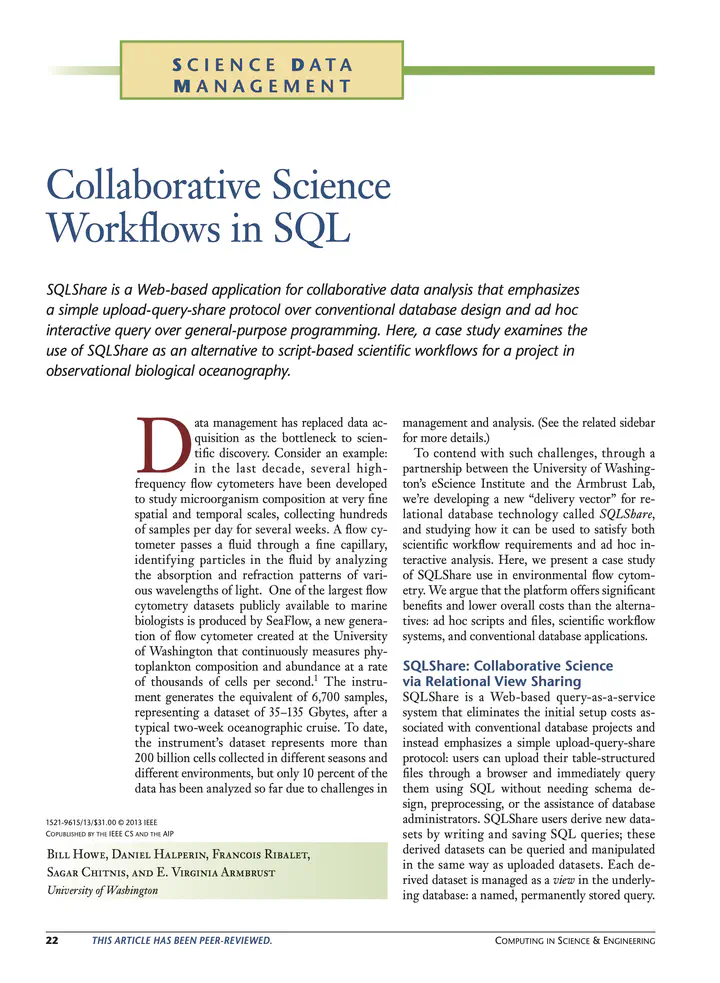 SQLShare is a Web-based application that emphasizes a simple upload-query-share protocol over conventional database design and uses ad hoc interactive query over general-purpose programming. Here, a case study examines the use of SQLShare as an alternative to script-based scientific workflows for a project in observational biological oceanography. © 1999-2011 IEEE.