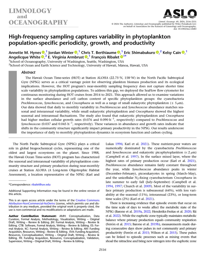 The Hawaii Ocean Time-series (HOT) at Station ALOHA (22.75°N, 158°W) in the North Pacific Subtropical Gyre (NPSG) serves as a critical vantage point for observing plankton biomass production and its ecological implications. However, the HOT program’s near-monthly sampling frequency does not capture shorter time scale variability in phytoplankton populations. To address this gap, we deployed the SeaFlow flow cytometer for continuous monitoring during HOT cruises from 2014 to 2021. This approach allowed us to examine variations in the surface abundance and cell carbon content of specific phytoplankton groups: the cyanobacteria Prochlorococcus, Synechococcus, and Crocosphaera as well as a range of small eukaryotic phytoplankton (≤ 5 μm). Our data showed that daily to monthly variability in Prochlorococcus and Synechococcus abundance matches seasonal and interannual variability, while small eukaryotic phytoplankton and Crocosphaera showed the highest seasonal and interannual fluctuations. The study also found that eukaryotic phytoplankton and Crocosphaera had higher median cellular growth rates (0.076 and 0.090h−1, respectively) compared to Prochlorococcus and Synechococcus (0.037 and 0.045h−1, respectively). These variances in abundance and growth rates indicate that shifts in the community structure significantly impact primary productivity in the NPSG. Our results underscore the importance of daily to monthly phytoplankton dynamics in ecosystem function and carbon cycling.