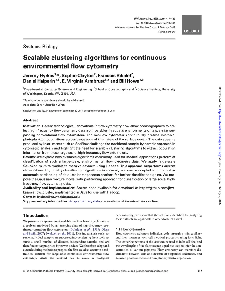 Motivation: Recent technological innovations in flow cytometry now allow oceanographers to collect high-frequency flow cytometry data from particles in aquatic environments on a scale far surpassing conventional flow cytometers. The SeaFlow cytometer continuously profiles microbial phytoplankton populations across thousands of kilometers of the surface ocean. The data streams produced by instruments such as SeaFlow challenge the traditional sample-by-sample approach in cytometric analysis and highlight the need for scalable clustering algorithms to extract population information from these large-scale, high-frequency flow cytometers.Results: We explore how available algorithms commonly used for medical applications perform at classification of such a large-scale, environmental flow cytometry data. We apply large-scale Gaussian mixture models to massive datasets using Hadoop. This approach outperforms current state-of-the-art cytometry classification algorithms in accuracy and can be coupled with manual or automatic partitioning of data into homogeneous sections for further classification gains. We propose the Gaussian mixture model with partitioning approach for classification of large-scale, high-frequency flow cytometry data.