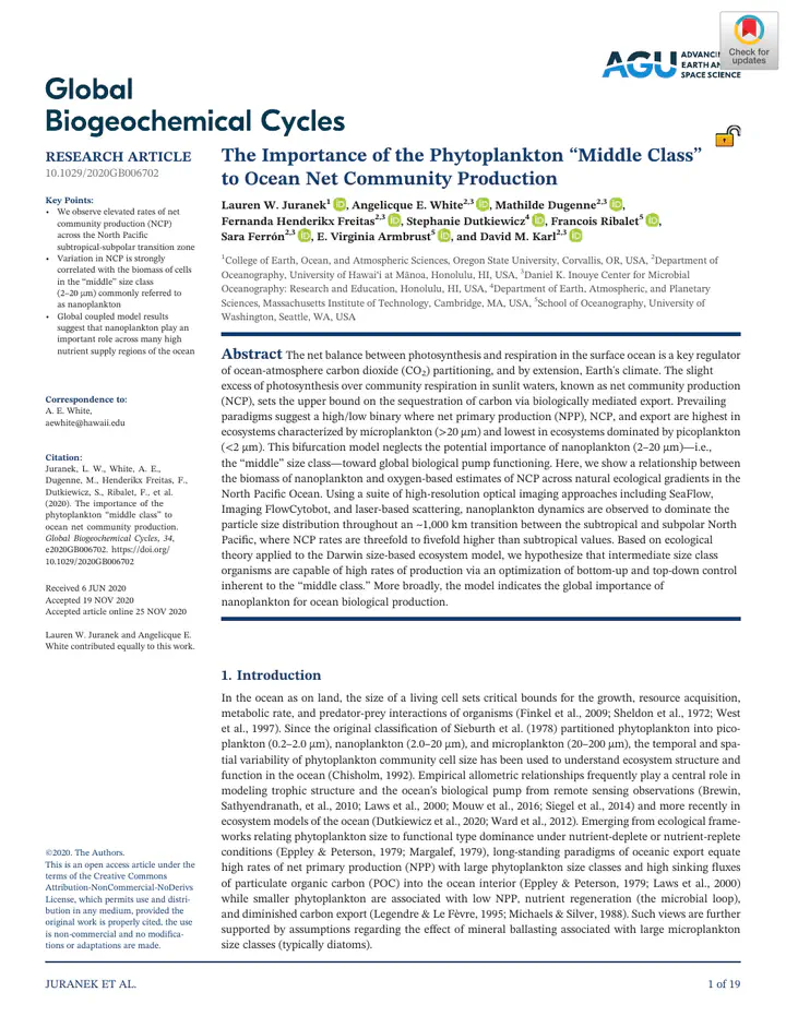 The net balance between photosynthesis and respiration in the surface ocean is a key regulator of ocean-atmosphere carbon dioxide (CO2) partitioning, and by extension, Earth’s climate. The slight excess of photosynthesis over community respiration in sunlit waters, known as net community production (NCP), sets the upper bound on the sequestration of carbon via biologically mediated export. Prevailing paradigms suggest a high/low binary where net primary production (NPP), NCP, and export are highest in ecosystems characterized by microplankton (>20 um) and lowest in ecosystems dominated by picoplankton (<2 um). This bifurcation model neglects the potential importance of nanoplankton (2–20 um)—i.e., the “middle” size class—toward global biological pump functioning. Here, we show a relationship between the biomass of nanoplankton and oxygen-based estimates of NCP across natural ecological gradients in the North Pacific Ocean. Using a suite of high-resolution optical imaging approaches including SeaFlow, Imaging FlowCytobot, and laser-based scattering, nanoplankton dynamics are observed to dominate the particle size distribution throughout a 1,000 km transition between the subtropical and subpolar North Pacific, where NCP rates are threefold to fivefold higher than subtropical values. Based on ecological theory applied to the Darwin size-based ecosystem model, we hypothesize that intermediate size class organisms are capable of high rates of production via an optimization of bottom-up and top-down control inherent to the “middle class.” More broadly, the model indicates the global importance of nanoplankton for ocean biological production.