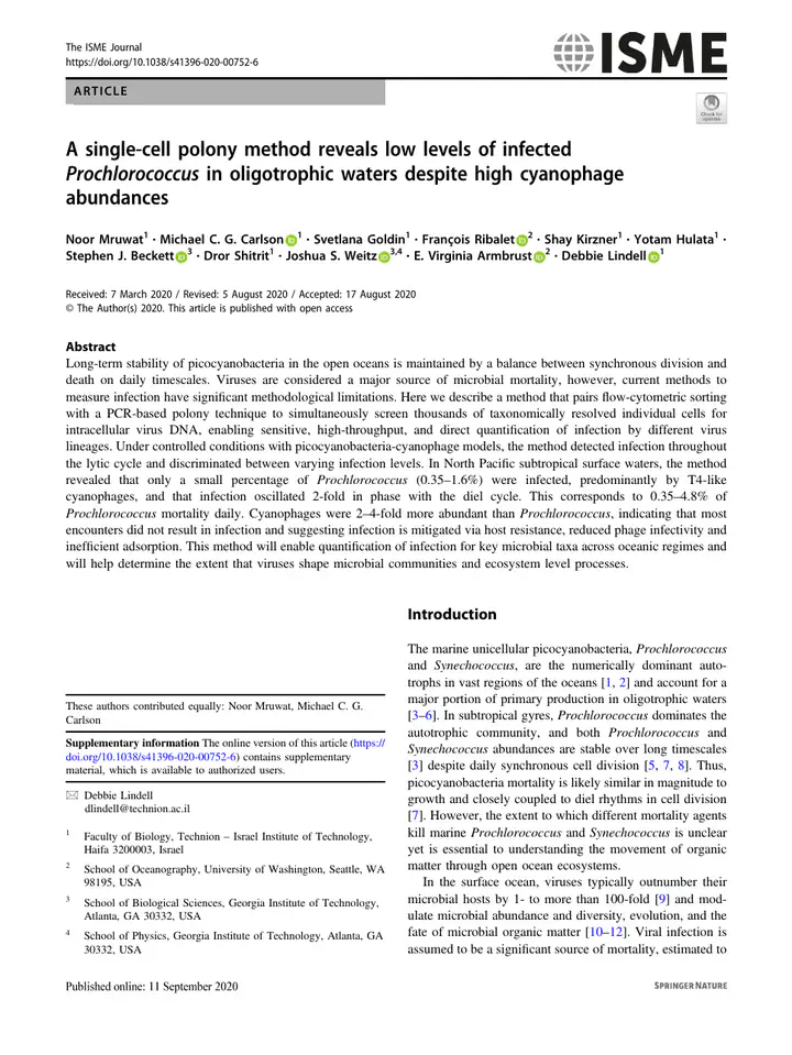 Long-term stability of picocyanobacteria in the open oceans is maintained by a balance between synchronous division and death on daily timescales. Viruses are considered a major source of microbial mortality, however, current methods to measure infection have significant methodological limitations. Here we describe a method that pairs flow-cytometric sorting with a PCR-based polony technique to simultaneously screen thousands of taxonomically resolved individual cells for intracellular virus DNA, enabling sensitive, high-throughput, and direct quantification of infection by different virus lineages. Under controlled conditions with picocyanobacteria-cyanophage models, the method detected infection throughout the lytic cycle and discriminated between varying infection levels. In North Pacific subtropical surface waters, the method revealed that only a small percentage of Prochlorococcus (0.35–1.6%) were infected, predominantly by T4-like cyanophages, and that infection oscillated 2-fold in phase with the diel cycle. This corresponds to 0.35–4.8% of Prochlorococcus mortality daily. Cyanophages were 2–4-fold more abundant than Prochlorococcus, indicating that most encounters did not result in infection and suggesting infection is mitigated via host resistance, reduced phage infectivity and inefficient adsorption. This method will enable quantification of infection for key microbial taxa across oceanic regimes and will help determine the extent that viruses shape microbial communities and ecosystem level processes.