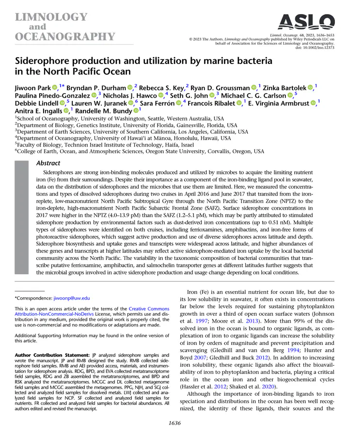 Siderophores are strong iron-binding molecules produced and utilized by microbes to acquire the limiting nutrient iron (Fe) from their surroundings. Despite their importance as a component of the iron-binding ligand pool in seawater, data on the distribution of siderophores and the microbes that use them are limited. Here, we measured the concentrations and types of dissolved siderophores during two cruises in April 2016 and June 2017 that transited from the iron-replete, low-macronutrient North Pacific Subtropical Gyre through the North Pacific Transition Zone (NPTZ) to the iron-deplete, high-macronutrient North Pacific Subarctic Frontal Zone (SAFZ). Surface siderophore concentrations in 2017 were higher in the NPTZ (4.0–13.9 pM) than the SAFZ (1.2–5.1 pM), which may be partly attributed to stimulated siderophore production by environmental factors such as dust-derived iron concentrations (up to 0.51 nM). Multiple types of siderophores were identified on both cruises, including ferrioxamines, amphibactins, and iron-free forms of photoreactive siderophores, which suggest active production and use of diverse siderophores across latitude and depth. Siderophore biosynthesis and uptake genes and transcripts were widespread across latitude, and higher abundances of these genes and transcripts at higher latitudes may reflect active siderophore-mediated iron uptake by the local bacterial community across the North Pacific. The variability in the taxonomic composition of bacterial communities that transcribe putative ferrioxamine, amphibactin, and salmochelin transporter genes at different latitudes further suggests that the microbial groups involved in active siderophore production and usage change depending on local conditions.