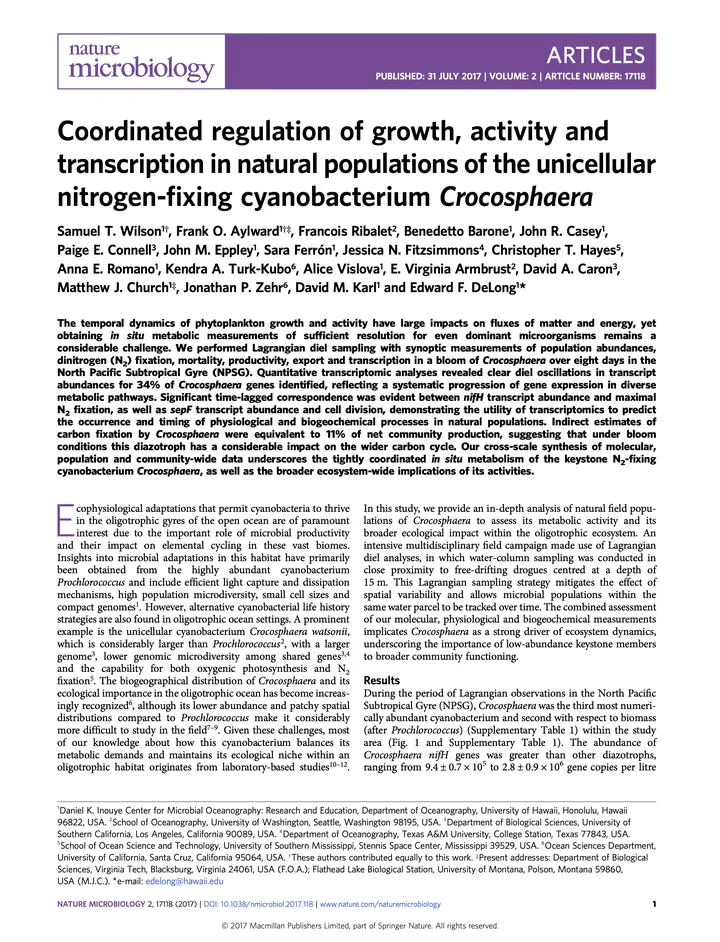 The temporal dynamics of phytoplankton growth and activity have large impacts on fluxes of matter and energy, yet obtaining in situ metabolic measurements of sufficient resolution for even dominant microorganisms remains a considerable challenge. We performed Lagrangian diel sampling with synoptic measurements of population abundances, dinitrogen (N2) fixation, mortality, productivity, export and transcription in a bloom of Crocosphaera over eight days in the North Pacific Subtropical Gyre (NPSG). Quantitative transcriptomic analyses revealed clear diel oscillations in transcript abundances for 34% of Crocosphaera genes identified, reflecting a systematic progression of gene expression in diverse metabolic pathways. Significant time-lagged correspondence was evident between nifH transcript abundance and maximal N2 fixation, as well as sepF transcript abundance and cell division, demonstrating the utility of transcriptomics to predict the occurrence and timing of physiological and biogeochemical processes in natural populations. Indirect estimates of carbon fixation by Crocosphaera were equivalent to 11% of net community production, suggesting that under bloom conditions this diazotroph has a considerable impact on the wider carbon cycle. Our cross-scale synthesis of molecular, population and community-wide data underscores the tightly coordinated in situ metabolism of the keystone N2-fixing cyanobacterium Crocosphaera, as well as the broader ecosystem-wide implications of its activities.