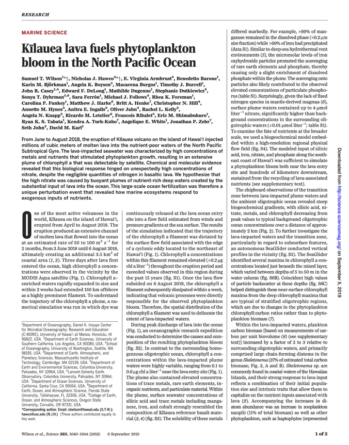 From June to August 2018, the eruption of Kīlauea volcano on the island of Hawai‘i injected millions of cubic meters of molten lava into the nutrient-poor waters of the North Pacific Subtropical Gyre.The lava-impacted seawater was characterized by high concentrations of metals and nutrients that stimulated phytoplankton growth, resulting in an extensive plume of chlorophyll a that was detectable by satellite. Chemical and molecular evidence revealed that this biological response hinged on unexpectedly high concentrations of nitrate, despite the negligible quantities of nitrogen in basaltic lava. We hypothesize that the high nitrate was caused by buoyant plumes of nutrient-rich deep waters created by the substantial input of lava into the ocean. This large-scale ocean fertilization was therefore a unique perturbation event that revealed how marine ecosystems respond to exogenous inputs of nutrients.