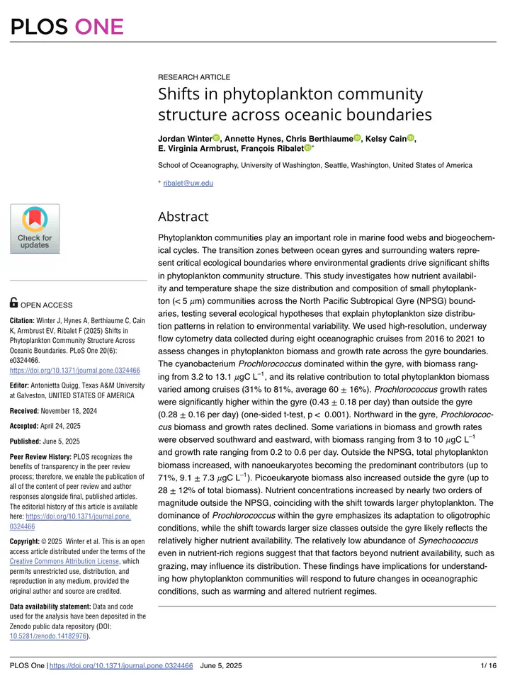 Phytoplankton communities play an important role in marine food webs and biogeochemical cycles. The transition zones between ocean gyres and surrounding waters represent critical ecological boundaries where environmental gradients drive significant shifts in phytoplankton community structure. This study investigates how nutrient availability and temperature shape the size distribution and composition of small phytoplankton (< 5 μm) communities across the North Pacific Subtropical Gyre (NPSG) boundaries, testing several ecological hypotheses that explain phytoplankton size distribution patterns in relation to environmental variability. We used high-resolution, underway flow cytometry data collected during eight oceanographic cruises from 2016 to 2021 to assess changes in phytoplankton biomass and growth rate across the gyre boundaries. The cyanobacterium Prochlorococcus dominated within the gyre, with biomass ranging from 3.2 to 13.1 μgC L−1, and its relative contribution to total phytoplankton biomass varied among cruises (31% to 81%, average 60 ± 16%). Prochlorococcus growth rates were significantly higher within the gyre (0.43 ± 0.18 per day) than outside the gyre (0.28 ± 0.16 per day) (one-sided t-test, p < 0.001). Northward in the gyre, Prochlorococcus biomass and growth rates declined. Some variations in biomass and growth rates were observed southward and eastward, with biomass ranging from 3 to 10 μgC L−1 and growth rate ranging from 0.2 to 0.6 per day. Outside the NPSG, total phytoplankton biomass increased, with nanoeukaryotes becoming the predominant contributors (up to 71%, 9.1 ± 7.3 μgC L−1). Picoeukaryote biomass also increased outside the gyre (up to 28 ± 12% of total biomass). Nutrient concentrations increased by nearly two orders of magnitude outside the NPSG, coinciding with the shift towards larger phytoplankton. The dominance of Prochlorococcus within the gyre emphasizes its adaptation to oligotrophic conditions, while the shift towards larger size classes outside the gyre likely reflects the relatively higher nutrient availability. The relatively low abundance of Synechococcus even in nutrient-rich regions suggest that that factors beyond nutrient availability, such as grazing, may influence its distribution. These findings have implications for understanding how phytoplankton communities will respond to future changes in oceanographic conditions, such as warming and altered nutrient regimes.